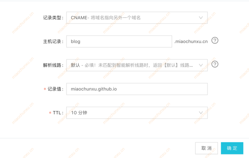- 主机记录: 可以使用@ 或者 www,图中我使用了二级域名 blog